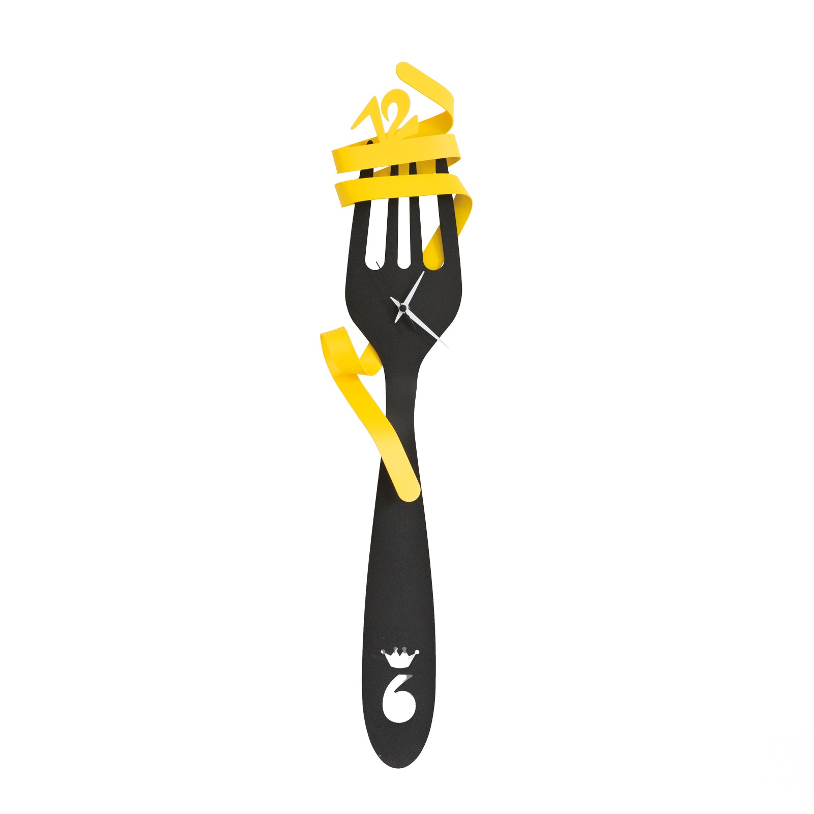One of the most original and recognizable pieces in the collection is undoubtedly the Italy-Italy wall clock, a true ode to Italian cuisine. The dial is transformed into an irresistible graphic game: a stylised fork twisted by a portion of pasta, from which the number 12 creatively emerges.
