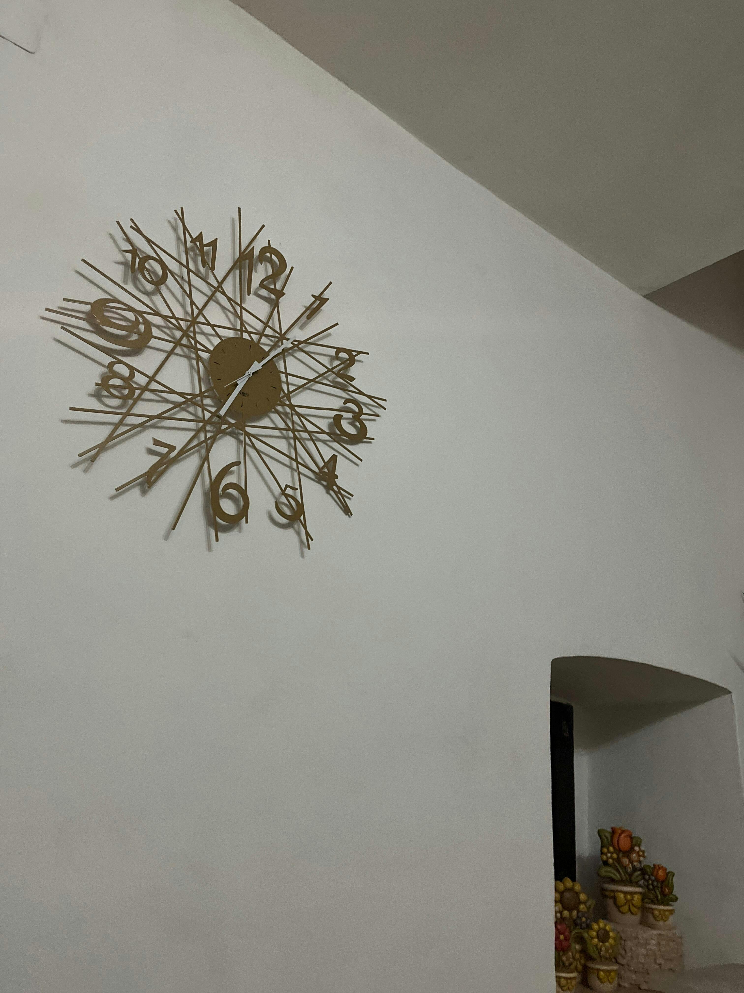 - Caratteristiche: Un orologio iconico caratterizzato da un quadrante circolare che ospita le lancette, da cui si dipartono una serie di linee rette intrecciate, tra cui sono incastonati i numeri arabi di diverse dimensioni. La procedura di montaggio sulla parete è facile